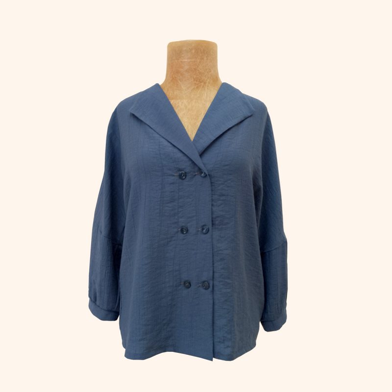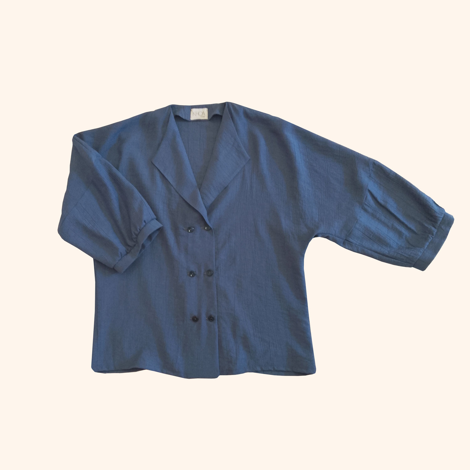 Blusa de corte amplio confeccionada en 90% viscosa y 10% poliéster, un tejido ligero, suave y resistente. Su diseño presenta doble botonadura frontal con botones oscuros, cuello de solapa abierta y mangas amplias con vuelta en el puño.