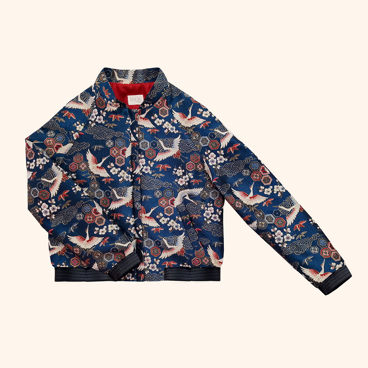 La bomber está confeccionada en un jacquard fabricado con hilo procedente de plástico reciclado, con certificado Oeko-tex. El estampado es de estilo oriental, con estampado de grullas sobre un fondo azul royal. Lleva un forro de sastrería en color teja y elástico de la parte inferior de color negro.