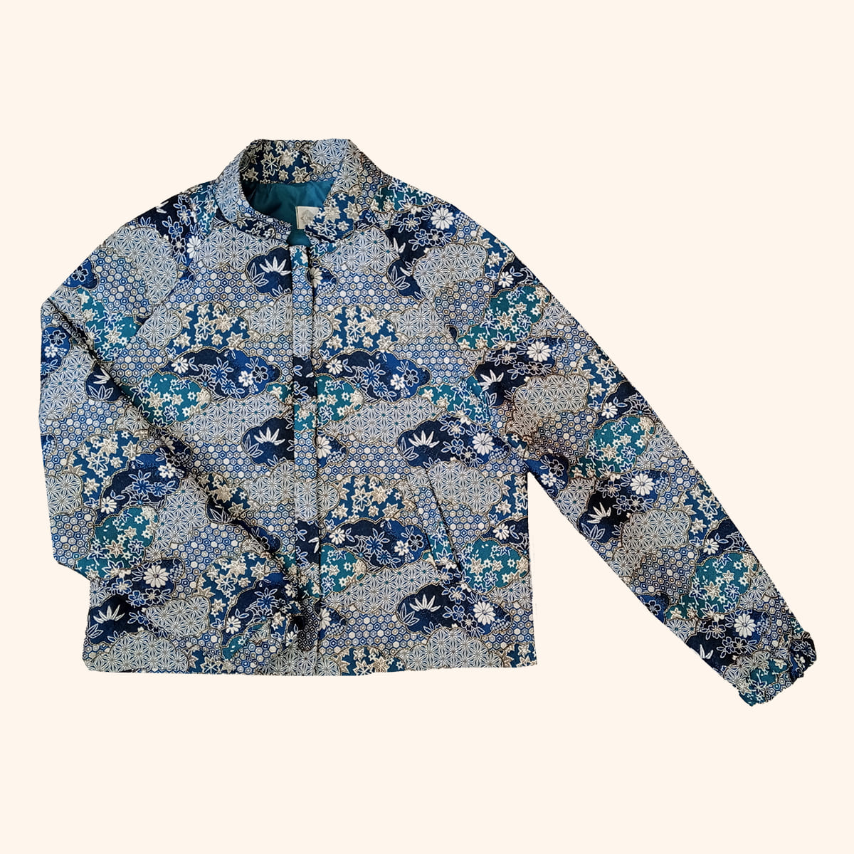 Cazadora tipo bomber diseñada y confeccionada en España, en edición limitada, con tejido jacquard reciclado y estampado oriental contemporáneo.