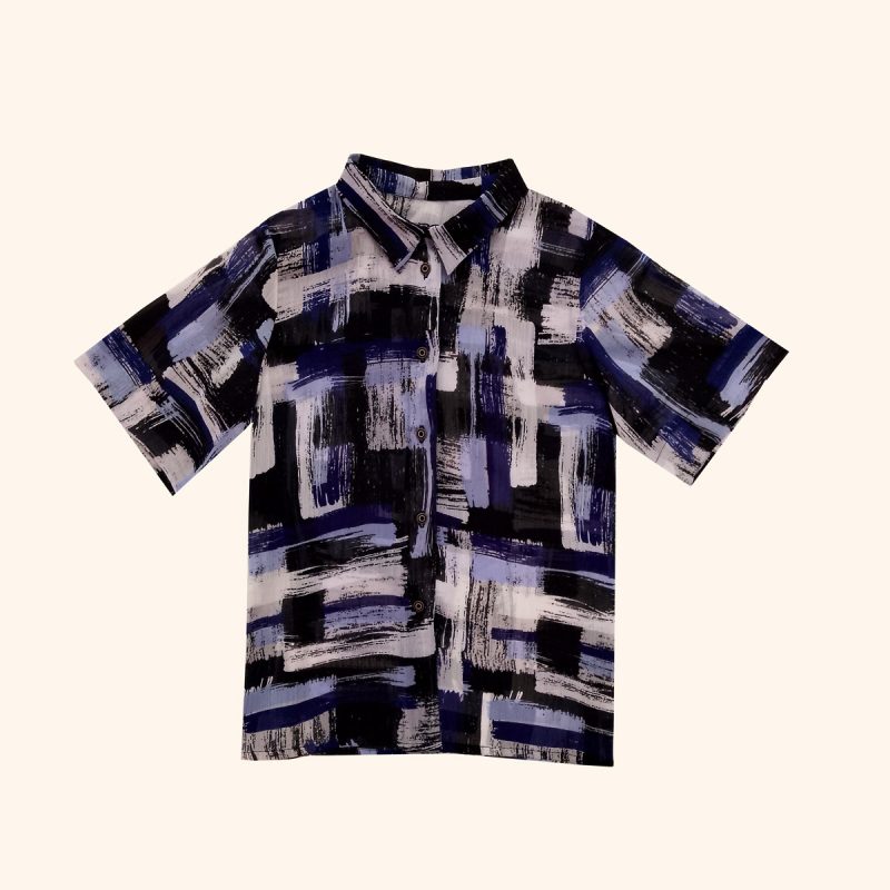 Camisa de gasa ligera confeccionada en poliéster con estampado de pinceladas abstractas en tonos azul, negro y blanco. Su corte recto y fluido, junto con el cuello camisero y la manga corta amplia, ofrecen frescura y comodidad. Los botones frontales completan un diseño versátil que aporta un aire artístico y contemporáneo. Ideal para combinar con pantalones, faldas o sobre un top ajustado, convirtiéndose en una prenda perfecta para looks casuales con un toque sofisticado.