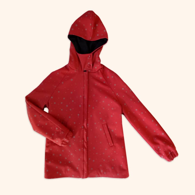 Chaquetón impermeable con capucha, puños elásticos y bolsillos de ojal, confeccionado en un resistente tejido softshell bicapa. La capa exterior, en vibrante tono rojo con un delicado estampado de gotas, es completamente impermeable y proporciona una eficaz protección contra la lluvia. La capa interior, en cálido forro polar, asegura confort y un aislamiento adicional frente al frío. El chaquetón lleva además un elegante forro de sastrería que aporta un acabado más confortable y sofisticado.