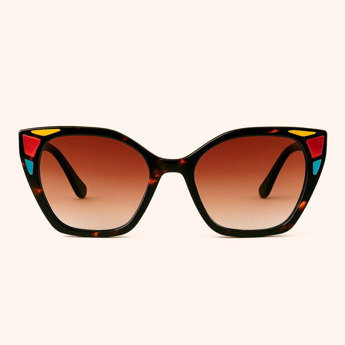 Gafas cat-eye en carey con detalles en rojo, amarillo y azul y lentes polarizadas marrón degradado. Diseño con aire ochentero. Hecho en España.