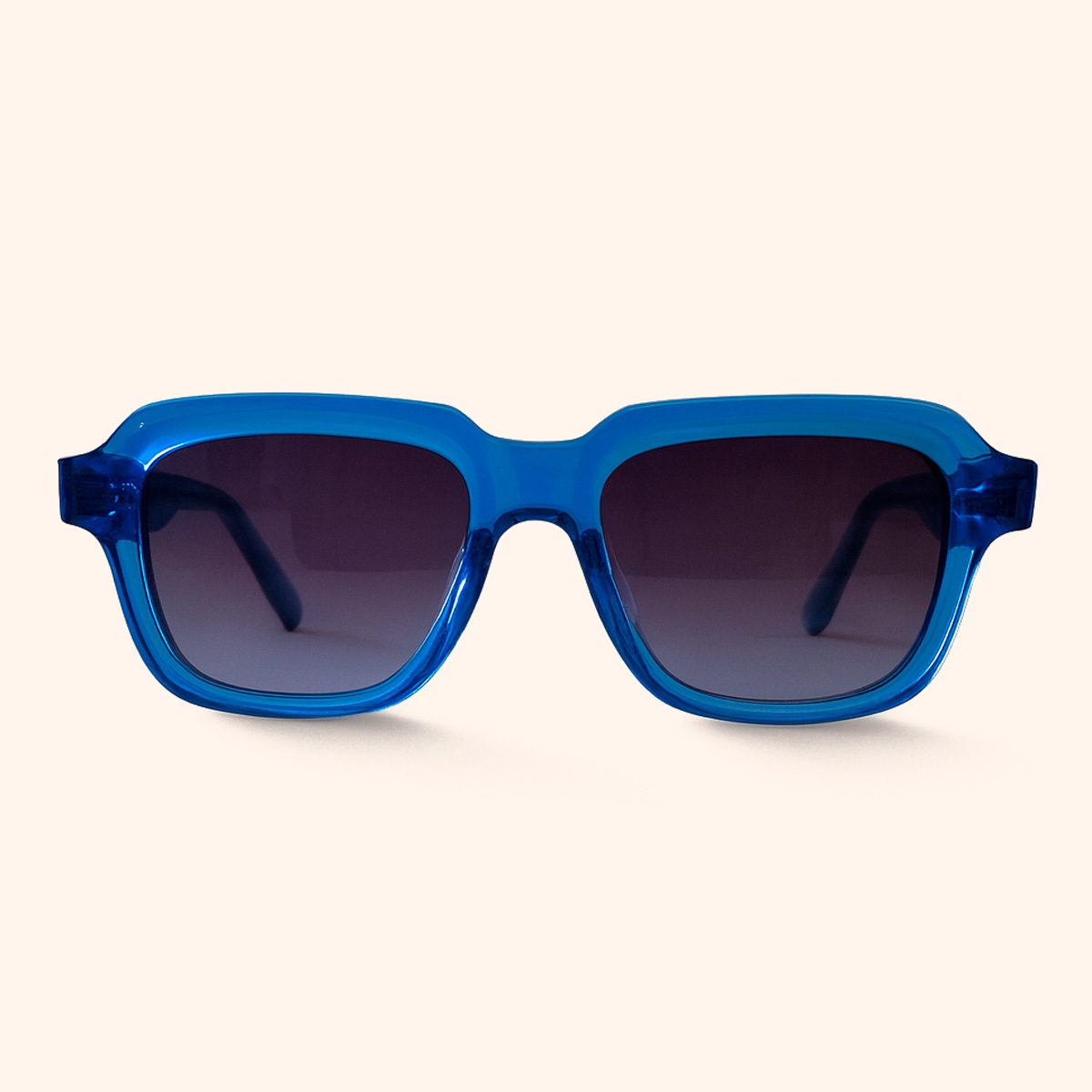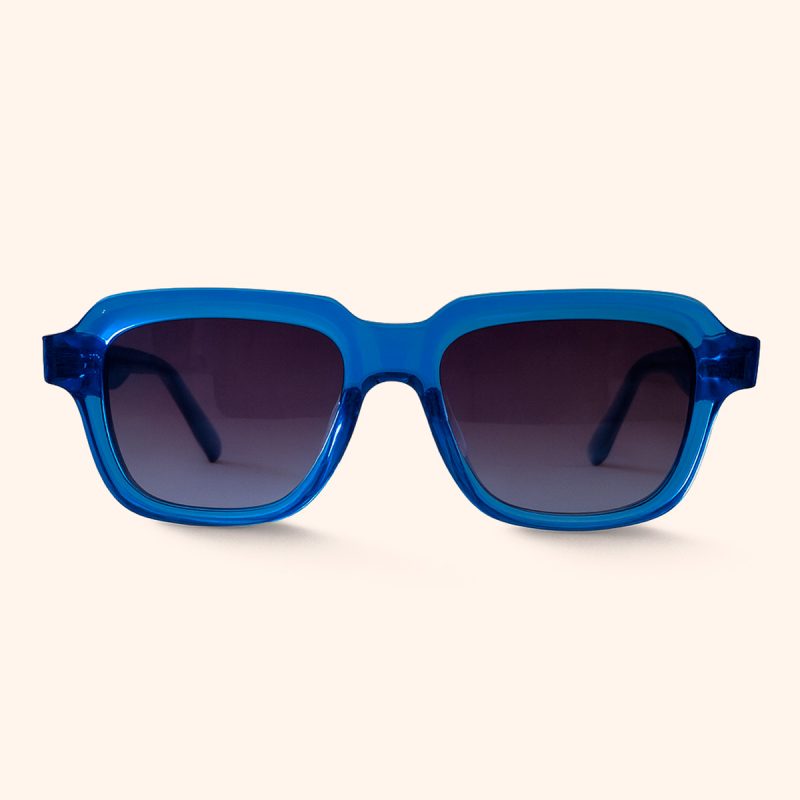 Gafas rectangulares en acetato azul translúcido, fabricadas en Madrid con lentes polarizadas degradadas gris ahumado. Estilo unisex, cómodo y moderno.
