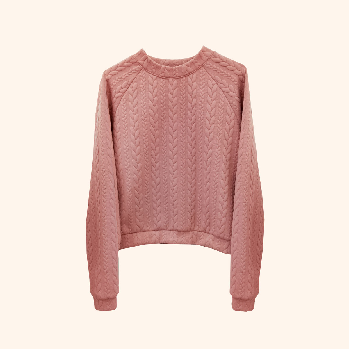 Sudadera con textura de espiga en relieve. De corte recto y cómodo, presenta cuello redondo, mangas largas tipo raglán y acabado elástico en puños y bajo para un ajuste relajado. Su tono rosa suave aporta un aire cálido y versátil, ideal para combinar en looks casuales y modernos.