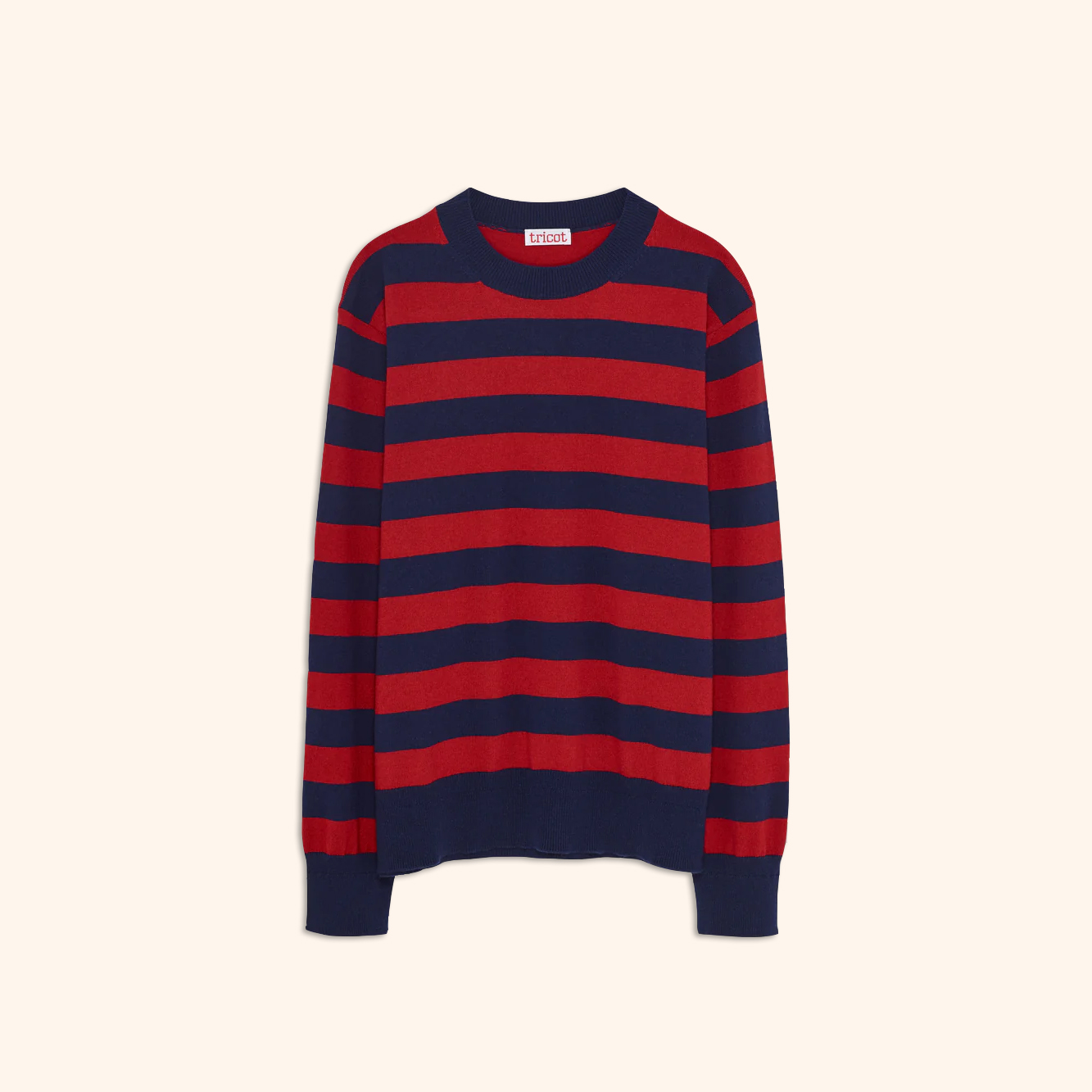 Confeccionado en exquisita lana de cachemir reciclada combinada con algodón orgánico, este jersey a rayas rojas y marino rinde homenaje al estilo marinero clásico con un aire contemporáneo. Su textura suave y ligera ofrece máxima comodidad, mientras que la combinación de colores intensos aporta carácter y personalidad. Una prenda versátil y sofisticada, ideal para quienes buscan elegancia con un toque audaz.