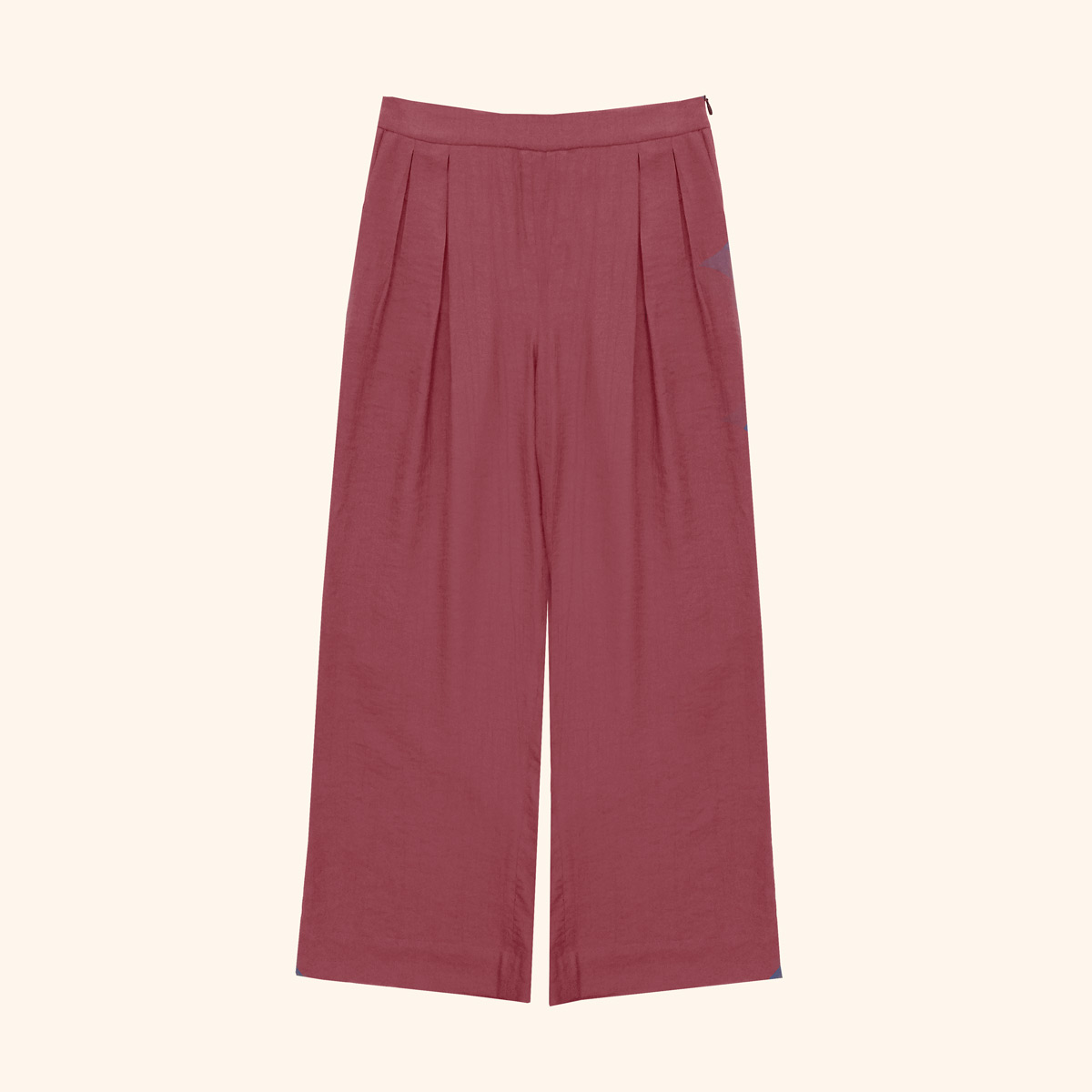 Pantalón de pinzas de corte sastre con cremallera lateral. Lleva pliegues en la parte delantera y elástico en la parte trasera, de modo que se ajusta a 2 tallas diferentes. El pantalón tiene bolsillos en ambos laterales. Confeccionado en viscosa ligera de color buganvilla con mucha caída; es una prenda muy fresca y cómoda. El largo queda por encima del tobillo.