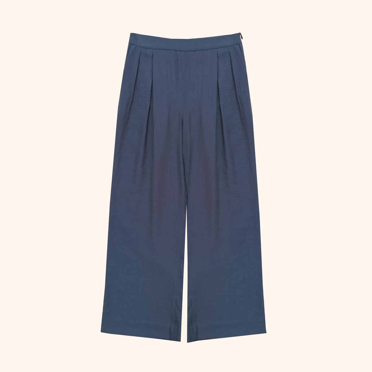 Pantalón de pinzas de corte sastre con cremallera lateral. Lleva pliegues en la parte delantera y elástico en la parte trasera, de modo que se ajusta a 2 tallas diferentes. El pantalón tiene bolsillos en ambos laterales. Confeccionado en viscosa ligera de color azul petróleo con mucha caída; es una prenda muy fresca y cómoda. El largo queda por encima del tobillo.
