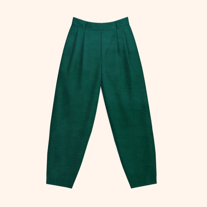 Pantalón confeccionado en pana fina de algodón suave y resistente en tono verde bosque. Presenta dos pliegues superiores y dos pinzas inferiores en cada lado, que aportan estructura y un ajuste refinado. El cierre lateral con cremallera mantiene el frente limpio y estiliza la silueta. Una prenda versátil y atemporal que combina la calidez de la pana con un corte cuidado, perfecta para elevar looks casuales o completar conjuntos más sofisticados.